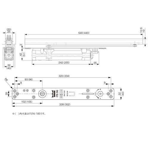 ●閉じ力(トルク調整型):3〜6番手●適用ドア(幅):1400(1200)mm以下 ●適用ドア(重量):180(160)kg以下 ●左右勝手兼用 ●取付方法;スライドチャンネル ●閉じ速度調整(2弁式):110°〜0° ●ラッチングアクション調整:7°〜0° ●調整式ストップ装置:オプション ●クッションリミットステイ ●最大ドア開き角度(丁番吊ストップ装置なし):約120° ●EN1154準拠(ヨーロッパ規格) 購入に関する注意事項 DORMA ドアクローザー ITS96 ・左右勝手兼用で逆付けも可能と、施工性に優れます。 ・無段階トルク調整式で、最適な番手に調整できます。 ・軽く開くので高齢者・お子様・女性にも優しい製品です。 ・耐久性能抜群の、50万回耐久テストクリア。 ご注意 ・室内ドアにご使用ください ・本品使用時は、必ず戸当りを設けてください。 (製品の特性上、最重要項目となります) ・詳細は専用カタログをご覧ください。 ・楕円軌道となる3次元隠し丁番との組合せは避けてください。 ・標準適用ドアの幅、重量でITS96-180の( )内の数字は、ピポットヒンジ吊りの場合です。