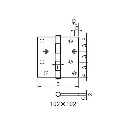 一般木製、アルミ出入口扉にご使用いただけます。 [サイズ]A102mm、B102mm、C2.0mm、D19mm、E10.0mm、F10.2mm、G27.2mm、L11.5mm [本体重量]230g [付属品]SUS十字穴付皿木ネジ 本数:8 太さ:3.5 長さ:25 [材質]SUS304 [仕上]ヘアーライン ●耐荷重(2枚使用時):20kgf 【ご注意】扉の開閉の多い学校、事務所、病院等にご使用いただく場合は摩耗率の低いリング入りの丁番をご用命いただくようお願いします。 購入に関する注意事項 備考 代表画像を表示しています。