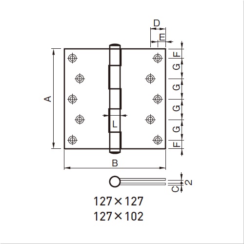 一般木製、アルミ出入口扉にご使用いただけます。 [サイズ]A127mm、B102mm、C2.5mm、D19mm、E10.0mm、F10.5mm、G26.5mm、L12.5mm [本体重量]414g [付属品]SUS十字穴付皿木ネジ 本数:10 太さ:3.8 長さ:25 [材質]SUS304 [仕上]アンバー ●耐荷重(2枚使用時):43kgf 【ご注意】扉の開閉の多い学校、事務所、病院等にご使用いただく場合は摩耗率の低いリング入りの丁番をご用命いただくようお願いします。 購入に関する注意事項