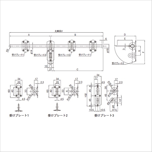 木扉の貫抜としてご使用いただけます。 ビス止めにて木扉に取付けられます。 [サイズ]丸棒径φ16mm、丸棒長さ450mm、A197.5mm、B252.5mm、C239mm、D104mm、E73.5mm、F115mm、G45mm [本体重量]980g [付属品]スチール十字穴付皿木ネジ 3.5×25:16本 [材質]スチール [仕上]ユニクロメッキ 購入に関する注意事項 備考 代表画像を表示しています。