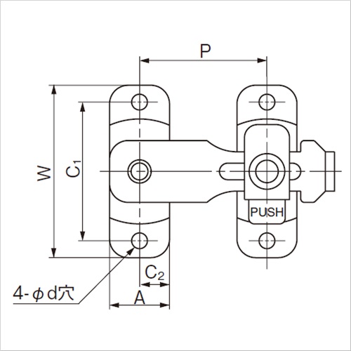 [サイズ]L:105mm、W:80mm、A:25mm、C1:66mm、C2:12.5mm、H1:26.5mm、H2:8mm、P:59±7mm、d:5.5mm[本体重量]182g [付属品]SUS十字穴付ナベタッピンネジ 5×20:4本 [材質]SUS304 [仕上]光沢研磨 購入に関する注意事項 特長 ・バネの力で掛金部を押えるため、振動などで掛金が外れるのを防止します。 ・掛金を外す時は、PUSH部を押してください。 ・通常の打掛と逆向きに取付けると、PUSH部をワンプッシュするだけで掛金が外れる便利な使い方ができます。