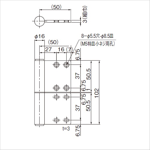 金属製の扉用の丁番です。重量のある金属製扉と枠を別々に持ち運びすることができ、簡単に吊り込みができる丁番です。 一般の戸建住宅用玄関ドアなどの開き戸、門扉などにご使用いただます。 [サイズ]羽根全長102mm、羽根巾50mm、羽根長50.5mm、板厚3mm、組巾3mm [本体重量]245g [材質]SUS304 [仕上]ヘアーライン ●適用扉サイズ(DW×DH):800×1800 ●耐荷重(2枚使用時):42kg ●取付け穴数(羽根1枚あたり):4 購入に関する注意事項 ご注意 ・左右の見方:扉を手前に引いて左吊元は左勝手 :扉を手前に引いて右吊元は右勝手 ・適用する裏板も用意しております。お問い合わせください。 ・扉に使用する場合は、扉・枠の形状・重量に合ったものをお選びください。 ・取付け用ネジは付属しておりません。