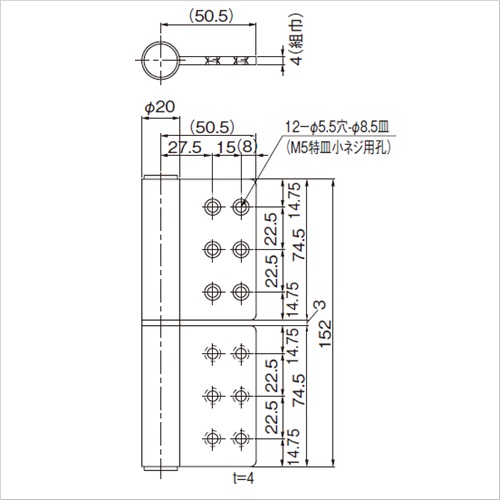 金属製の扉用の丁番です。重量のある金属製扉と枠を別々に持ち運びすることができ、簡単に吊り込みができる丁番です。 一般の戸建住宅用玄関ドアなどの開き戸、門扉などにご使用いただます。 [サイズ]羽根全長152mm、羽根巾50.5mm、羽根長74.5mm、板厚4mm、組巾4mm [本体重量]512g [材質]SUS304 [仕上]ヘアーライン ●適用扉サイズ(DW×DH):1100×2200 ●耐荷重(2枚使用時):82kg ●取付け穴数(羽根1枚あたり):6 購入に関する注意事項 ご注意 ・左右の見方:扉を手前に引いて左吊元は左勝手 :扉を手前に引いて右吊元は右勝手 ・適用する裏板も用意しております。お問い合わせください。 ・扉に使用する場合は、扉・枠の形状・重量に合ったものをお選びください。 ・取付け用ネジは付属しておりません。