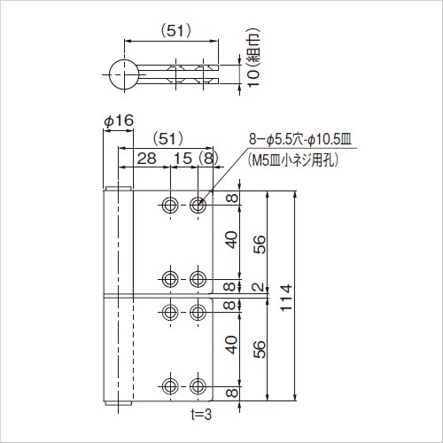 組巾-羽根の板厚が、1mm以上クリアランスが出る面付旗丁番です。(上下の羽根にクリアランスが出るタイプです)組巾-羽根の板厚が、2mm以上クリアランスが出るタイプは、アルミ製扉にも使用されています。 [サイズ]羽根全長114mm、羽根巾51mm、羽根長56mm、板厚3mm、組巾10mm [本体重量]274g [材質]SUS304 [仕上]ヘアーライン ●適用扉サイズ(DW×DH):800×1800 ●耐荷重(2枚使用時):45kg ●取付け穴数(羽根1枚あたり):4 購入に関する注意事項 ご注意 ・左右の見方:扉を手前に引いて左吊元は左勝手 :扉を手前に引いて右吊元は右勝手 ・適用する裏板も用意しております。お問い合わせください。 ・扉に使用する場合は、扉・枠の形状・重量に合ったものをお選びください。 ・取付け用ネジは付属しておりません。