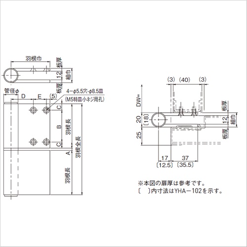 扉にネジ止めし、枠に対して溶接して取付けるタイプの旗丁番です。 [サイズ]羽根全長149mm、羽根巾54mm、羽根長73mm、組巾20mm、板厚4mm、管径20mm、A3mm、B44mm、C14.5mm、D18mm、E31mm [本体重量]542g [材質]SUS304 [仕上]ヘアーライン ●適用扉サイズ(DW×DH):1100×2200 ●耐荷重(2枚使用時):88kg ●耐荷重(3枚使用時):110kg ●取付け穴数(上羽根のみ):4 【ご注意】取付け用ネジは付属しておりません。 購入に関する注意事項 備考 代表画像を表示しています。