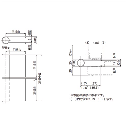 枠・扉に溶接して、取付けるタイプの旗丁番です。 [サイズ]羽根全長149mm、羽根巾54mm、羽根長73mm、組巾20mm、板厚4mm、管径20mm、A3mm [本体重量]550g [材質]SUS304 [仕上]ヘアーライン ●適用扉サイズ(DW×DH):1100×2200 ●耐荷重(2枚使用時):88kg ●耐荷重(3枚使用時):110kg 購入に関する注意事項 備考 代表画像を表示しています。