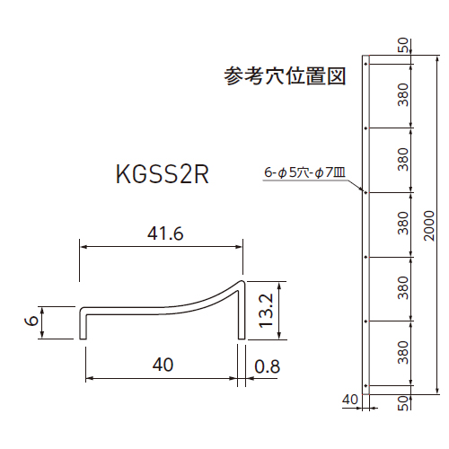 [品番/呼称]KGSS2R[サイズ]40×13.2×6×2000mm [重量]1.0kg [材質]SUS304・SPV [仕上げ]ヘアーライン [備考]穴付 購入に関する注意事項 特長 ・SUS304の採用で耐久性、美観に優れています。 ・既製部材以外の別注品も製作可能です。 ・KGS2R・KGS3Rはアール型で内・外開きに使用でき、スキ間も目隠しになります。 ご注意 取付穴付も製作可能です。(両端50mmの位置よりφ5穴-φ7皿が6ヵ所)