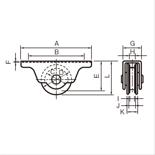 アングルレール及び平板レールのどちらでもご使用になれます。ベアリングは440Cを使用しています。 門扉、工場出入口門扉、各種倉庫用扉などにご使用いただけます。 [サイズ]A145mm、B111mm、Cφ53mm、Dφ70mm、E69mm、F2.5mm、G36mm、H10mm、I7.5mm、J15.5mm、K23.5mm、L77.5mm [本体重量]0.82kg [材質]枠・芯棒・車:SUS304 [仕上]ヘアーライン ●適用レール幅(別途):6 ●耐荷重(2個あたり):400kgf 購入に関する注意事項