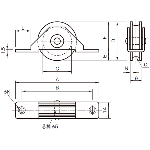 枠の折り返しがないため堀り込み部分が少なく納まります。 [サイズ]A:68mm、B:57mm、D:30mm、E:6mm、F:24mm、K:4mm、L:12.5mm [本体重量]65g [材質]枠・芯棒:SUS304、車:SUS303 [仕上]バレル研磨 ●枠厚:1.5 ●芯棒:5 ●耐荷重(2個あたり):30kfg 購入に関する注意事項