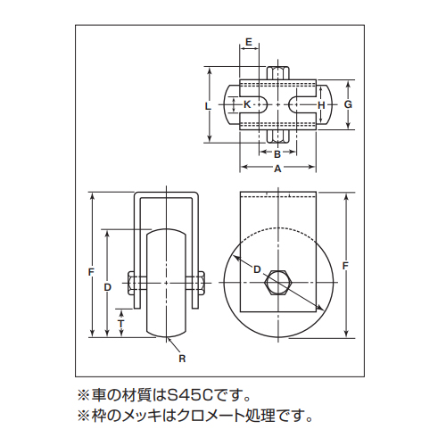 [サイズ]90mm(A60, B35, D90, E12.5, F117, G38, H27, K14, L53, R(R)25, T22)[板厚]SPCC t4 [ベアリング]#6203ZZ [軸(ボルト)]鉄 M12×48 [自重]1525g [耐荷重(1ケ当り)]350kg [材質]枠・芯棒:スチール、車:S45C 購入に関する注意事項 画像は代表画像です 特長 重量のある扉に最適です。 用途 学校の門扉・倉庫・工場などの引き戸・観音扉etc