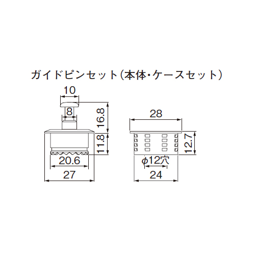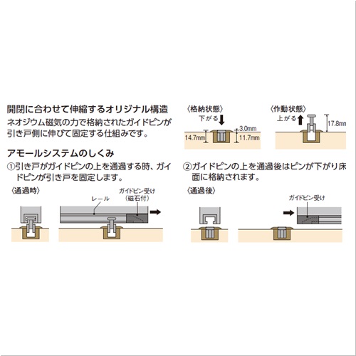 [材質]・本体:ABS・鉄(クロームメッキ) ・ケース:ナイロン [色]ダークブラウン 購入に関する注意事項 代表画像を表示しています。 特長 ・下レールがなくても、床に埋め込まれたガイドピンが引き戸のふれを抑えます。標準的な床材の厚さ12mmに納まる設計です。 ・床面からの高さが3mmで円形なため、段差によるつまずきを防止します。 ・ガイドピンは左右に2mmずつ調整でき、簡単に引き戸とのセンター合わせができます。 ご注意 ・ガイドピンが引き戸の厚みのセンターにくるように調整してはめこんでください。 ・必要寸法に応じてレールを垂直に切断してください。 ・背丈の高い引き戸で取付け位置を決める時は揺れが発生し易くなりますので、必ず場所ごと吊込み静止状態を確認した上で、引き戸センターになるよう正しく位置決めしてください。(参照) ・引き戸に反り、ねじれが出ている場合は、正しい取付けをされても正常に作動しませんのでご注意ください。 ・床暖房設置の床面では施工できない場合があります。ご注意ください。