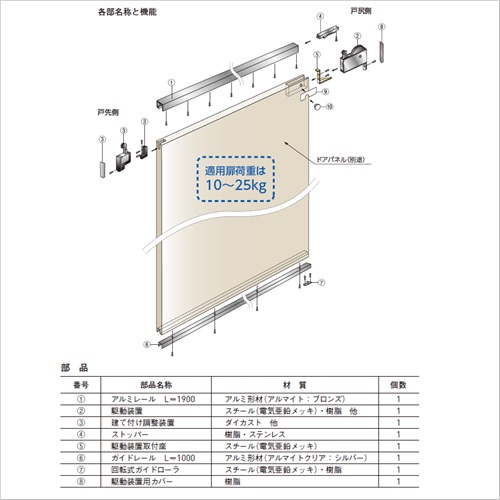 [サイズ]レール 1900L[最大ストローク]900mm [最大ドア質量]25kg [開閉制御方法]ゼンマイ・粘性ダンパー [開閉力の調整]手動 [セット内容]アルミレール、駆動装置、建て付け調整装置、ストッパー、駆動装置取付座、ガイドレール、回転式ガイドローラー、駆動装置用カバー、扉用取り扱いシール、穴キャップ、下穴ガイドプレート [材質]アルミレール(アルマイト・ブロンズ)駆動装置(スチール・樹脂他)建て付け調整装置(ダイカスト他)ストッパー(樹脂・ステンレス)駆動装置取付座(スチール)ガイドレール(アルマイトクリア:シルバー)回転式ガイドローラー(スチール・樹脂)駆動装置用カバー(樹脂) [備考]ドアパネル別途 購入に関する注意事項 各部名称と機能 (1)アルミレール:標準サイズで、長さ1900mm、高さ25mm、奥行き35mm。扉を支えながら開閉させるベースとなる部品です。 (2)駆動装置:扉の戸尻側に取付けます。バネをゼンマイ巻き調整することで、開閉速度を調整します。 (3)建て付け調整装置:扉の戸先側に取付け、建て付けを調整します。上下±3mm、左右±2mmの調整範囲があります。(鴨居と扉のすき間4〜10mm) (4)ストッパー:扉の開き幅を決定する部品で、レールに取付けます。制御用ラック側から挿入します。任意の位置に取付可能です。 (5)駆動装置取付座:扉(戸尻側)の駆動装置が収まる彫込み部分に付く金具です。 (6)ガイドレール:扉の下側を彫込んで取付けます。扉のブレを防ぐためのレールです。 (7)回転式ガイドローラ:戸尻側の床に取付けます。この突起がガイドレールを通ります。 (8)駆動装置用カバー:すべての作業の終了後、駆動装置の小口部分にビス止めします。 (9)扉用取り扱いシール(10)穴キャップ(11)下穴ガイドプレート駆動装置((2))の取付穴の位置決めに使用します。