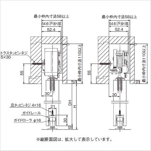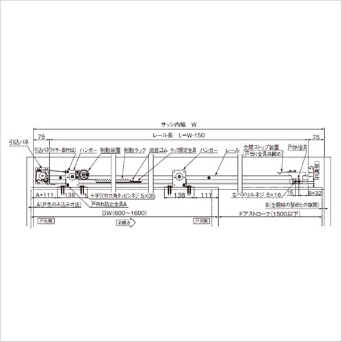 ・長寿命制動装置は流体摩擦抵抗方式、ワンウェイクラッチ機構を採用し、確実な制御・小型・長寿命を実現しました。 ・軽い開扉力 扉抵抗が小さいため、お年寄りやお子様、身体の不自由な方でも軽く扉を開けられます。 扉質量30kgにおける初動開扉力 水平式 AN-CW60Vタイプ・・・6.9N 傾斜式 AD-CW30V・60Vタイプ・・・6.1N ・簡単施工 枠側への加工はレール取付穴のみとし、部品は全てドライバーと付属の六角で取付ができるので、簡単に施工が行えます。 ・左右兼用 簡単な操作で左右の開き勝手が変更できます。 ・用途 住宅・病院・学校・介護福祉施設等。 引込バネで扉を閉じるレール水平式上吊り式引き戸で床面をバリアフリ-にできます。 木建軽量建具仕様として必要な部品を標準装備しています。 水平式は傾斜式に比べ、レールの収まり枠の高さを20mm低く抑えることができます。(最小枠内寸法110mm以上) 制御装置は流体摩擦抵抗方式、ワンウェイクラッチ機構を採用し、確実な制御と長寿命を実現。 また、簡単操作で左右の開き勝手の変更が可能です。 プラス(+)ドライバーと付属の六角レンチで施工が可能です。 ガイドレール、ガイドローラ付。 ●適用扉 質量:10〜60kg 幅:1200〜1600mm ●レール長:3.1m ●初動開扉力:6.3〜8.5N ●制動装置型式:SC-C06V ●仕様 最大ストローク:1500mm 閉駆動方式:ゼンマイバネ式 制動方式:流体摩擦抵抗型 閉じ時間設定範囲:7〜11秒(開扉900mmから全閉までの閉じ時間) 使用温度範囲:-10〜40℃ 耐久性:開閉50万回以上 【ご注意】ガイドローラは必ずご使用ください。ハンガー取付用の六角タッピンネジが付属されております。 購入に関する注意事項 【要別途送料】別途送料が必要な商品です。詳細は営業へお問合せください。