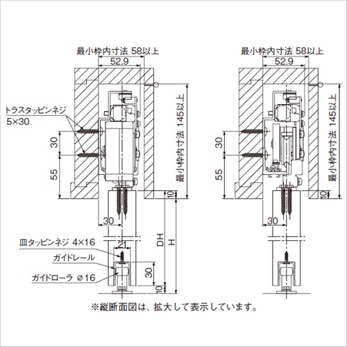 開扉時に扉を戸袋に収め、引込バネで扉を閉じるレール水平式です。上吊り式引き戸で床面をバリアフリ-にできます。 木建軽量建具仕様として必要な部品を標準装備しています。 ドア質量10〜60kg壁収納タイプは、壁収納用ストップ戸当り(全開ストップ装置)を用いているので、 戸袋の壁パネルを納めた後もメンテナンスしやすくなります。 壁収納タイプの水平式は壁収納タイプの傾斜式に比べ、 レールの収まり枠の高さを20mm低く抑えることができます。(最小枠内寸法145mm以上) 制御装置は流体摩擦抵抗方式、ワンウェイクラッチ機構を採用し、確実な制御と長寿命を実現します。 また、簡単操作で左右の開き勝手の変更が可能です。 プラス(+)ドライバーと付属の六角レンチで施工が可能です。 ガイドレール、ガイドローラ付。 ●適用扉:質量10〜60kg 幅600〜1200mm ●レール長:2.2m ●初動開扉力:6.3〜8.5N ●制動装置型式:SC-C06V ●仕様 最大ストローク:1500mm 閉駆動方式:ゼンマイバネ式 制動方式:流体摩擦抵抗型 閉じ時間設定範囲:7〜11秒(開扉900mmから全閉までの閉じ時間) 使用温度範囲:-10〜40℃ 耐久性:開閉50万回以上 【ご注意】ガイドローラは必ずご使用ください。ハンガー取付用の六角タッピンネジが付属されています。 購入に関する注意事項
