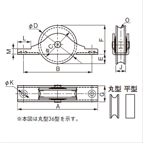 室内の引き戸にご使用いただけます。防音性に優れたエチレン酢ビコポリマーを走行面に優れたPA6を軸部分の中芯に使用しています。 [サイズ]A:66mm、B:58.5mm、D:30mm、E:7mm、F:23mm、G:14.5mm、J:8mm、K:3.2mm、L:10.5mm、M:1.6mm [本体重量]30g [材質]枠:スチール、車:エチレン酢ビコポリマー(外側)・PA6(内側)、軸:スチール [仕上]電気亜鉛メッキ ●芯棒:6 ●耐荷重(2個あたり):20kfg ●枠厚:1.6 購入に関する注意事項