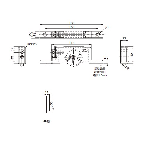 [材質] 枠:SUS304、車:SUS303(ベアリング入)[仕上げ] バレル研磨 [耐荷重] 200kgf(2個あたり) [重量] 540g 購入に関するご注意 特長 ・戸を外さず、再度からの上下調整が可能です。調整範囲は5mmです。 ・寺院の木製大型重量建具など、重量のある建具に適しています。 ご注意 ・調整時は戸を上げて行ってください ・戸の位置が上がり過ぎたり下がり過ぎたり傾いたりしている場合は、戸車の調整ネジを六角スパナーで回して車の上下調整をしてください。