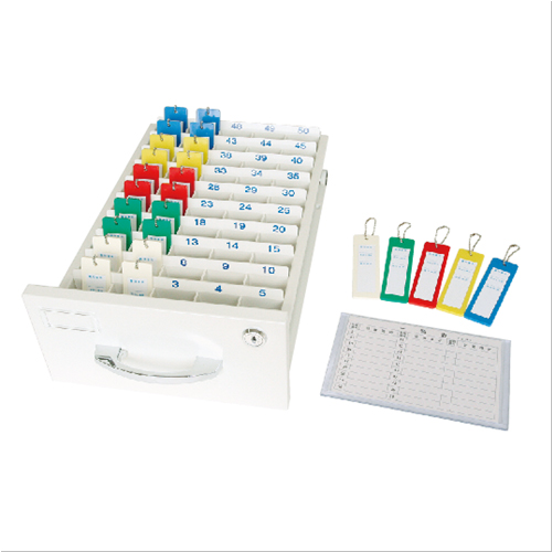 [サイズ]H281mm、間口265mm、奥行380mm[本体重量]13kg [材質]スチール [仕上]メラミン焼付塗装 購入に関する注意事項 特長 ・小型書庫の上に置けるよう、奥行を380mmにしてあります。 ・升目仕切りでキープレートが3枚位入ります。 ・整理しやすく、各引出しに一覧表が備え付けてあります。 ・引出し内の整理番号と引出し番号の組合わせで、いくつでも整理できます。 ・1ヶ所の鍵(2本付)ですべての引出しがロックされます。 ・キープレートは30×100mmと大型で玉クサリ付です。(単品 120円/枚 アイボリー、赤、青、黄、緑) ・キープレートサイズ 30×100 t=3.0 キープレート付属数 ・D-50Nは、5色×10枚ずつ ・D-100Nは、5色×20枚ずつ ・D-150Nは、5色×30枚ずつ ・D-200Nは、5色×40枚ずつ ・D-300Nは、5色×60枚ずつ