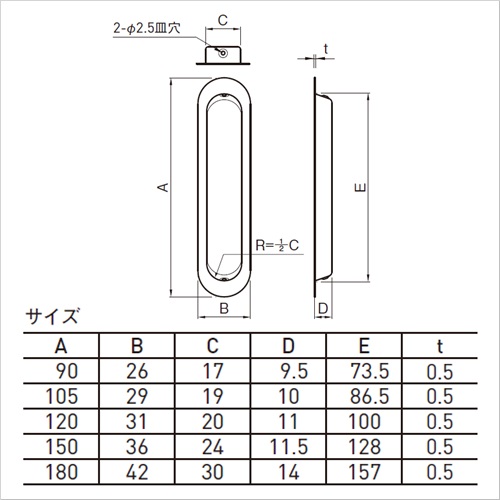 仕上げによるバリエーションが7タイプございます。 [サイズ]A90mm、B26mm、C17mm、D9.5mm、E73.5mm、t0.5mm [本体重量]11.9g [付属品]SUS十字穴付皿スリムネジ2×16:2本 [材質]SUS304 [仕上]塗装 購入に関する注意事項 代表画像を表示しています。