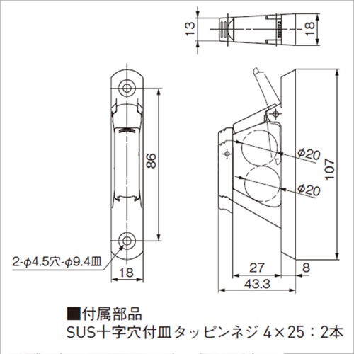 [サイズ]表記による[本体重量]131g [付属品]SUS十字穴付皿タッピンネジ 4×25:2本 [材質]ステンレス [仕上]鏡面研磨 [適合ロープ径] φ20以下×2本 [吊下荷重]40kgf 購入に関する注意事項 特長 ・物を掛けるとワンタッチで開閉部がバネの力で閉まり、物が外れにくくなるナス環フックです。 ・船舶・住宅・商店等の屋外用のフックのほか、ペットをつなぎ止めるリードフックとしても最適です。 ・ドアや窓の枠に取り付けられる幅の狭いタイプです。 ・EN-E107は太さφ20までの鎖やロープが2本まで掛けられます。 ・EN-E107は、のようにラッチ部分を押し下げると、アームが上にも開くため、より多く物が掛けられ、すばやく取外せます。