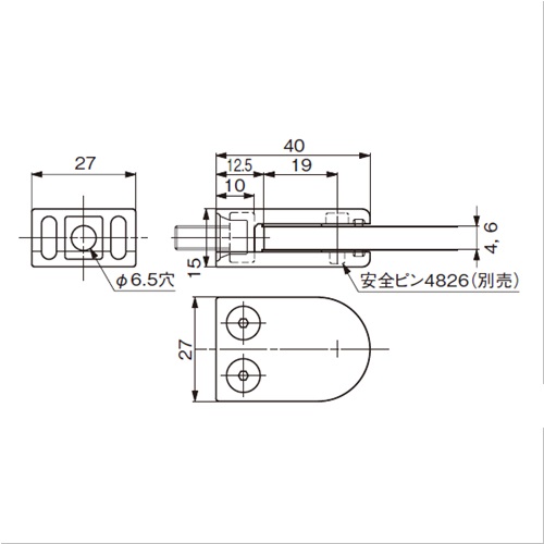 [サイズ]表記による[本体重量]52g [材質]亜鉛合金(ZDC) [仕上]ダルクロムめっき [適応ガラス厚]4 [付属品]六角穴付ボルト(特殊)M6×10(取付ボルト) 購入に関する注意事項 オプション部品:安全ピン4826(別売)