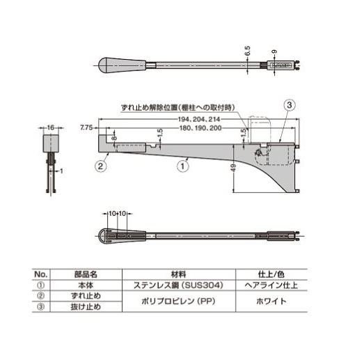 [サイズ]48mm×19mm×200mm[材質]SUS430・PP [仕上]サテン [棚奥行]200以下 [耐荷重/2本]10kgf [耐荷重/3本]15kgf [質量]65g [色]白 [備考]SP(B)専用 購入に関する注意事項 特長 ・本品2本または3本で棚板1枚を取り付けられます。 ・棚板を簡易的に保持する、ずれ止め付きです。 ・棚板の奥行は3段階から選べます。 ・本品が不意に棚柱から外れるのを防止する抜け止め付です。 ・ガラス棚板の使用もできます。 ご注意 ・最大棚板サイズは幅900×奥行200です。 ・棚柱の壁面への固定には、呼び3で20mm以上のねじを使用し、柱などのしっかりした下地がある位置に取り付けてください。