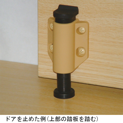 ドアを自由な位置で止められます。立ったまま踏むだけで操作できます。 取付けゲージ付で施工が簡単です。 室内の軽量木製ドア用です。 [本体重量]60g [付属品]スチール十字穴付トラス、取付ゲージ タッピンネジ 3.5×20:4本 [材質]ポリアミド6・ゴム 【ご注意】床面はフローリングなど固く、傾斜のない場所でご使用ください。ドアを完全に固定するものではありません。戸当り、ステーなどと併用してください。 購入に関する注意事項