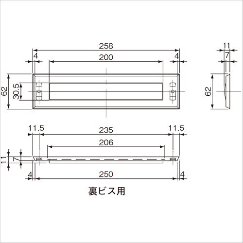 郵便物差入口にご使用いただけます。 [サイズ]外形:H62mm×W258mm、投入口:H30.5mm×W200mm [本体重量]160g [付属品]SUS 十字穴付皿木ネジ:5×45:2本 [材質]SUS304 [仕上]ヘアーライン 購入に関する注意事項