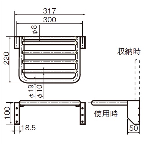 使用していない時は、バネにより棚が上がった状態で収納されています。 [サイズ]H100mm×W317mm×D220mm [本体重量]2kg [材質]SUS304 [仕上]研磨 [耐荷重]最大20kgf未満 購入に関する注意事項 ご注意 取付け位置上部に収納スペースが220mm以上必要になります。