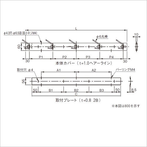 フック部分は使用しない時には図のように倒れるので邪魔になりません。帽子掛以外にも掃除用具掛としてもご利用いただけます。 [サイズ]L:450mm、P1:195mm、P2:195mm、A1:202mm、B1:250mm、C:350mm [本体重量]540g [材質]SUS304 [仕上]ヘアーライン ●耐荷重:5kgf 【ご注意】本商品は本体カバーと取付プレートで構成されています。取付プレートを壁面に先に取付け、その上から本体カバーを被せ、上下を皿小ネジM 4 で固定させます。 購入に関する注意事項 備考 代表画像を表示しています。
