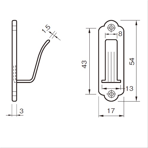 カーテンの房を掛ける金物です。 [本体重量]15g [付属品]SUS十字穴付丸皿木ネジ2.4×13:2本 [材質]SUS304 [仕上]ヘアーライン ●耐荷重:10kgf 購入に関する注意事項