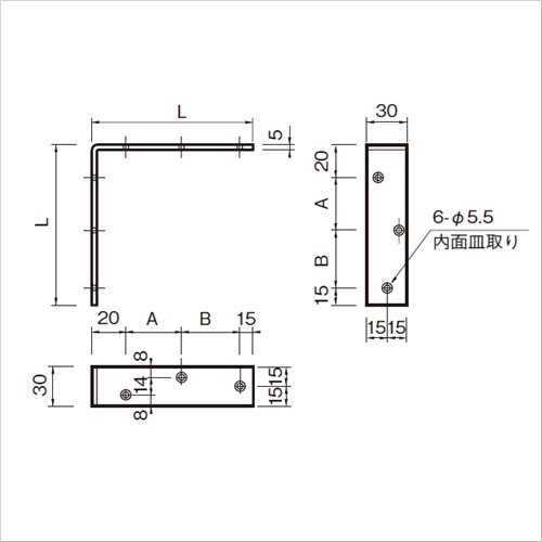[サイズ]A70mm、B75mm、L180mm[本体重量]412g [材質]SUS304 [仕上]ヘアーライン ●耐荷重(1本あたり):25kgf ●使用木ネジ(別途):4.5×30 【ご注意】片面(内面)皿取りです。運搬諸経費は別途お問い合わせください。 購入に関する注意事項