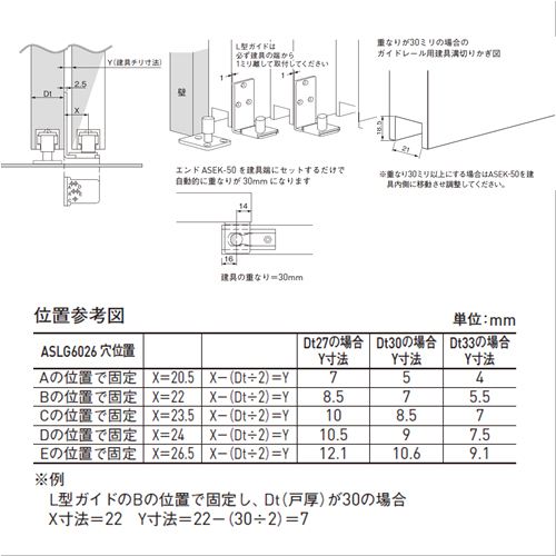 ・切り欠が必要な製品は必ず現物で寸法合わせをしてください。 [品番/呼称]ASGR-1000 [サイズ]表記による [重量]250g [材質]アルミ [仕上げ]B2 [ご注意] ※重なり30ミリ以上にする場合はASEK-50を建具内側に移動させ調整してください。 購入に関する注意事項