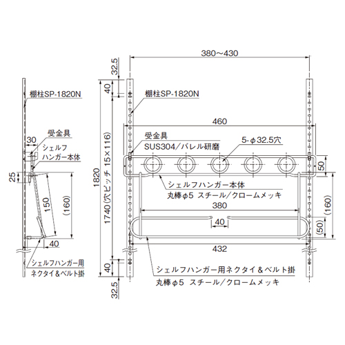 棚柱SPタイプにシェルフハンガーを取付け、パイプを5本通して棚としてご使用いただけます。パイプを1本だけ通して普通のパイプハンガーとしてもご使用いただけます。 (パイプφ32用)専用のオプションパーツとして、ネクタイ&ベルト掛を用意しております。 [サイズ]460mm×50mm [本体重量]523g [付属品]受金具4個 [材質]スチール・SUS304 [仕上]クロームメッキ・バレル研磨 ●耐荷重:5kgf 【ご注意】棚柱1本に対し、受金具を1個ずつ取付け、シェルフハンガー本体を掛けます。この時、受金具の高さは全て同じになるように取付けてください。棚柱2本の取付ピッチは、基本的に380〜430mmです。ネクタイ&ベルト掛は、シェルフハンガー本体の下の丸棒に直接掛けて使用します。シェルフハンガーは、本体2本、受金具4個のセット品です。本商品は、棚柱SPタイプ専用です。163-369 棚柱SP-1820Nを別途ご用意ください。シェルフハンガー1セットにつき、棚柱は4本必要です。パイプφ32は、別途ご用意ください。 購入に関する注意事項