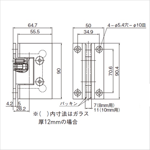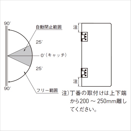[主材料]黄銅[仕上]サチライトクロムめっき [扉幅]760以下 [扉高さ/2ヶ]1980以下 [扉高さ/3ヶ]2200以下 [ガラス厚]10〜12 [耐荷重]40kgf [開き角度]180° [質量]796g [付属品] ・木ねじ4.8×50 ・プラグ 購入に関する注意事項 特長 ・内蔵部品はステンレス鋼(SUS304)製で、シャワーブースや浴室での使用が可能です。 ・約90°で扉を簡易保持します。 ・設置場所に合わせて別売品のガラスエッジプロテクターをご使用ください。 ご注意 ・取扱い上のご注意を必ずご確認ください。 ・ガラスサイズは耐荷重を優先して決めてください。 ・扉は約90°では止まらないため、これ以上開かないように戸当りを別途設けてください。 ・取り付け後に、扉が閉まった際の0°を調整する機能はありません。取付面とガラスドアの角度を調整しながら作業を行ってください。 ・シャワーブース仕様のため、1日に開閉頻度の多い商業用(店舗間仕切りなど)には使用できません。 ・丁番の取り付け位置は、上下端から200〜250mm離してください。