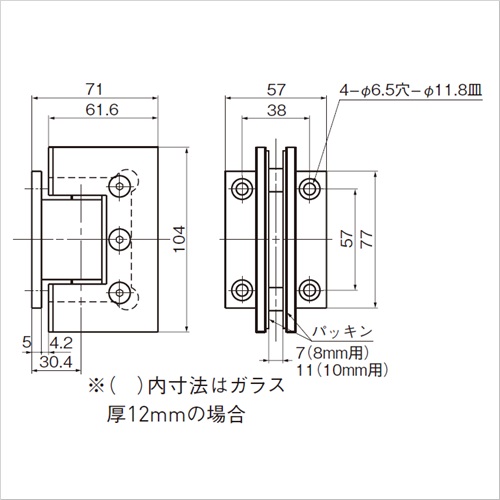 [本体重量]940g[材質]真鍮 [仕上]クロムメッキ [ガラス厚(A)]6,8 [耐荷重]441N/ペア(45kgf/ペア) [最大扉幅]760 [付属品]木ねじ4.8×50/プラグ 購入に関する注意事項 特長 ・内蔵部品はステンレス(SUS304)を素材としていますので、シャワーブースや浴室、サウナなどの水気のある場所でも比較的、長期間の使用が可能です。 ・このタイプは右・左に90°開きますが、0°に近づくにつれて自動的にキャッチが作動し、0°で固定します。(±80°) ・同一デザインでガラス厚6〜8mm用とガラス厚10〜13mm用の2種類があります。 ご注意 ・シャワーブース仕様で、一日に開閉頻度の多い商業用(店舗間仕切りなど)には不向きです。 ・90°開いた所で扉を止めるストッパー機構は付いていません。90°で止まるように必ず戸当りをご用意ください。 ・2個使い扉高さ1980mm以下にて、3個使い扉高さ2400mm以下にてご使用ください。