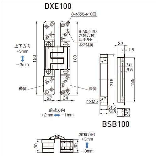 ステンレス鋼製 三次元調整機能付隠し丁番 DXE100