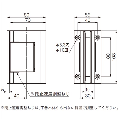 [仕上]サテンステンレス調[材料]アルミニウム合金 [扉幅]700〜1000 [ガラス厚]8、10、12、13.5 [耐荷重]100kgf [質量]695g [使用温度]-10℃〜50℃ [付属品] ・ねじキャップ ・戸先角度調整用プレート (2枚入り) 購入に関する注意事項 特長 ・ブラックが新しく加わりました。 ・ソフトクロージング機構、閉止速度調整機能付きのガラスドア丁番です。 ・ガラス扉は約80°開いた所から0°にかけてゆっくりと閉まります。 ・約90°で扉を簡易保持します。 ・シャワーブースなどの水回りでもご使用いただけます。 ・ゼロポジション(閉止位置)調整機能付も対応可能です。 ご注意 ・取扱い上のご注意を必ずご確認ください。 ・ガラスサイズは耐荷重を優先して決めてください。 ・扉は約90°では止まらないため、これ以上開かないように別途戸当りを設けてください。 ・上下の丁番の閉止速度は必ず揃えてください。 ・強制的に扉を開閉した場合、ソフトクロージング機構の構造上、金属音が発生します。