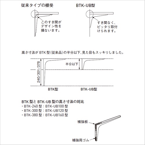 [サイズ]199×18×99.5mm[本体重量]170g [付属品]スチール十字穴付丸皿木ネジ [材質]スチール [仕上]粉体焼付塗装 [色]ホワイト [耐荷重(1本あたり)]12kgf 購入に関する注意事項 画像は代表画像です。 特長 ・高さ寸法がBTK型の半分以下です。壁取付け面が短くコンパクトな仕様です。 ・天板下のスペースをすっきりと有効活用できます。 ・深絞り成形で十分な強度があります。さらに、裏側を補強版で強化した安全設計です。 ・石膏ボードの壁面へ沈み込みを防ぐ補強用ゴム付きです。 ・コーナーの内側にすき間なくピッタリ取付けできます。 ご注意 ・棚受として使用する際の荷重による傾きを防ぐため、開き角度が90℃より少し広くなっています。現品にてご確認ください。 ・運搬諸経費は別途お問い合わせください。 ・入数単位にて受注承ります。