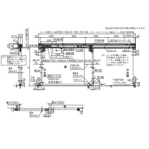 [材質]レール:アルミ、引込装置:樹脂、吊車:樹脂、ダイカスト[色]レール:シルバー、引込装置:シルバー、黒 [重量]5.0kg 購入に関する注意事項 ※画像は代表画像です。 特長 ・公共施設対応・一般家庭対応上吊式木製引戸用の自閉引き込み装置です。 ・レール壁付けのアウトセット仕様により、枠加工の必要がなく施工が簡単です。 ・引戸が閉まりきる手前で引込機能が働き、ゆっくりと確実に閉まります。 ・扉質量10〜35kgの木製建具用、左右勝手あり。 ・扉幅700〜1050mmまで対応 扉厚30mm以上。 ・木製建具に必要なガイドレール、回転式ガイドローラーや取付ねじが全てセット。 ・アシストバネ採用により開扉力を軽減(PAT.)、スムーズに開扉します。 ・片吊車の採用により、レールを外さず吊車のメンテナンス・交換が簡単です。 ・扉を任意の位置でストップできるフリーストップ機能と扉を全開保持できる全開ストッパー付です。 ・戸先側・戸尻側共に戸当り部品を標準セット。 ご注意 ・扉に寄り掛かったり、強い衝撃を加えたり、勢いよく開閉しないでください。 ・戸袋納まりには使用できません。 ・両引き分け納まりには使用できません。 ・構造上、開閉時に引き込み装置から作動音が発生します。また、引き込み装置作動時は通常の扉と比較して開扉が若干重たく感じます。 ・レールに潤滑剤は使用しないでください。 ・引き残しを100mm以上設定してください。 ・扱いの荒い使用が考えられる所では使用しないでください。 ・屋内仕様です。屋外での使用は避けてください。