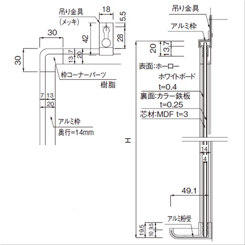 [色]枠:濃いグレー色、ボード:ホワイト[品番/呼称]UHM-456 [サイズ]H450mm、W600mm [重量]3kg [付属部品]ボードマーカー:黒・赤各1本、イレーザー:1個、マグネット:2個 [材質]枠:アルミ、ボード:ホーロー ●仕様:タテ書2段 購入に関する注意事項 ・別注で罫引きも承りますのでご相談ください。 ・マグネット式アルミ粉受けは、特注サイズの製作 (W寸法 3550mm以下)も可能です。 特長 ・アルミ枠は電解着色のグレー仕上げです。 ・ボードの角は丸みのある樹脂コーナー材を採用していますので安全です。 ・ボードの芯材に軽くて丈夫なMDFパネルを採用しています。 ・マグネットが使用できます。