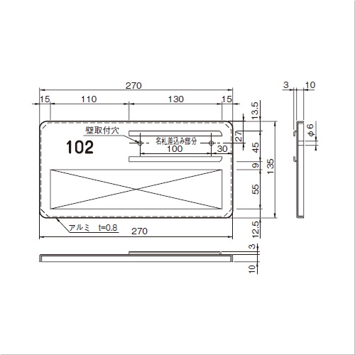 [サイズ]270×13×135mm[本体重量]270g [付属品]SUS十字穴付皿木ネジ 3.1×25:2本 [材質]アルミ [仕上]アルマイト 購入に関する注意事項 ご注意 ・名札差込み部分には、名札としてケント紙、及び名札押え板として合成樹脂透明板(厚み0.5mm、両側を曲げこんだもの)を差込みます。 ・氏名、部屋番号は別途となります。 ・部屋番号にはファスカルシールをご参照ください。