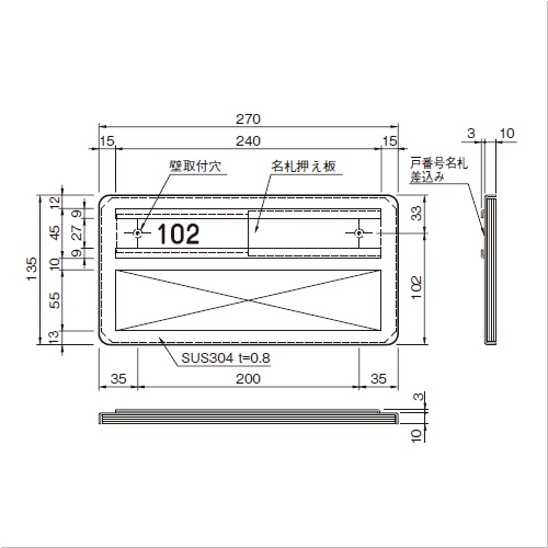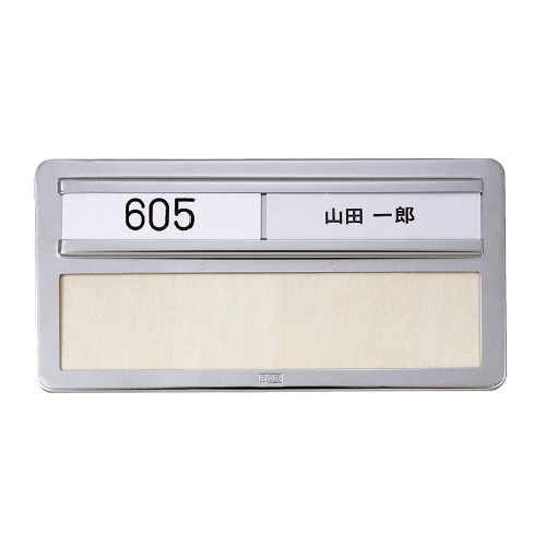 [サイズ]200×13×102mm[本体重量]430g [付属品]SUS十字穴付皿木ネジ 3.1×25:2本 [材質]SUS304 [仕上]研磨 購入に関する注意事項 ご注意 ・番号部、名札部共、横から差込式です。 ・名札部はフィルムケント紙です。 ・氏名、部屋番号(塩ビプレート)は別途となります。
