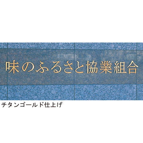 ・真鍮・ステンレス・銅のいずれかで製作するボックスタイプの文字です。・チタンゴールド仕上げは、真鍮磨き、HL(ヘアーライン)、金メッキに変わる仕上げです。ステンレス材にチタンコーティングすることで、真鍮や金メッキと同じように仕上げることができます。さらに、真鍮よりも耐久性が高く、金メッキよりも低価格です。 [サイズ]400角×深さは10mm〜45mm [付属部品]寸切りボルトM3〜M6 [材質]ステンレス(HL・磨き) [仕上げ]表面:チタンゴールド 側面:チタンゴールド [ご注意] ・仕様はハンダ付け、溶接、タッピング加工とします。 ・深さは文字の大きさの1/10を推奨とします。 ・チタンゴールド仕上品の側面仕上げは、表面同色塗装になります。 ・施工壁がガラス板以外はいずれも下記の方法で施工できます。 タイル、モルタル壁の場合は振動ドリル。ステンレス、アルミ板などの場合は普通ドリル。で穴を開けて接着剤を併用して文字のアンカーを差込みます。 ・納期:お問い合わせください。 購入に関する注意事項 ・文字をご指定下さい。