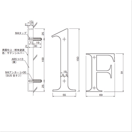 書体はTimes New Romanを採用し、デザイン性の高い階数表示です。材質はABSで、サテンシルバーの粉体塗装を前面・側面に施しました。 仕上げに一体感があり、耐候性にも優れています。 原寸型紙付で施工時の取付けが簡単です。 [サイズ]153x96x13mm [本体重量]40g [材質]ABS [仕上]粉体塗装 【ご注意】アンカー(付属品)にて施工します。 購入に関する注意事項 備考 代表画像を表示しています。