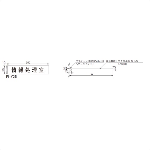 [品番/呼称]FI-Y25[サイズ]H50mm、W260mm [重量]110g [材質]表示板:アクリル白 黒印刷 金具:SUS304 [仕上げ]ヘアーライン [備考]UV印刷含む 購入に関する注意事項 ご注意 ・UV印刷は屋内専用です。屋外で使用される場合は、別途ご相談ください。 ・国土交通省8-43-1・2該当品です。 ・納期:ご確認ください。 プレート印刷参考一覧 参考一覧です。