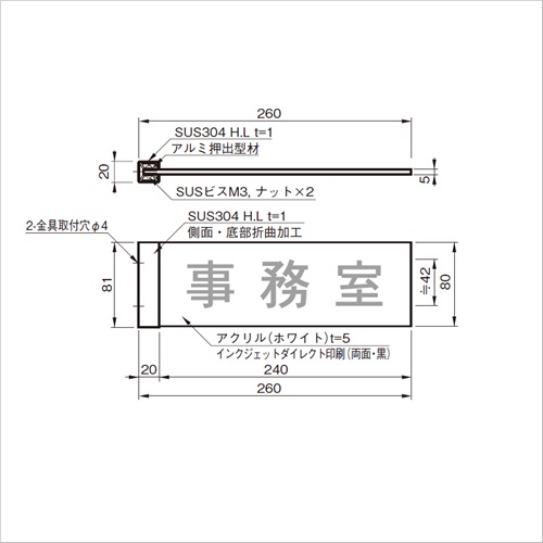 [品番/呼称]TA-248[サイズ]H80mm、W260mm、D5mm [重量]170g [材質]取付金具:SUS 304、表示板:アクリル(白乳) [仕上げ]ヘアーライン [備考]インクジェットダイレクト印刷 購入に関する注意事項 ・名札印刷参考一覧表より文字をご指定ください。詳細はお問い合わせください ・納期:ご確認ください。 ・代表画像です。 ご注意 ・屋内用です。 ・文字入りの場合はインクジェットダイレクト印刷で黒文字です。