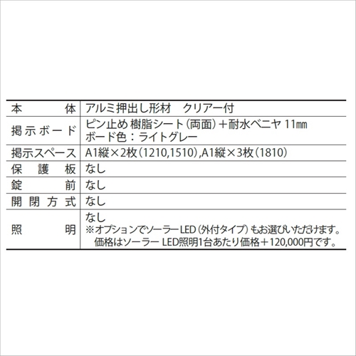 [本体色]ダークブロンズ(BD)[外寸法]W1612×H1800 [掲示有効寸法]W1492×H885 [重量]21kg [形式]自立型 [本体]アルミ押出し形材 クリアー付 [掲示ボード]ピン止め 樹脂シート(両面)+耐水ベニヤ 11mm ボード色:ライトグレー [掲示スペース]A1縦×2枚 [保護板]なし [錠前]なし [開閉方式]なし [照明]なし 購入に関する注意事項 【要別途送料】別途送料が必要な商品です。詳細は営業へお問合せください。 ・オプションでソーラーLED(外付タイプ)もお選びいただけます。(別途有料) ・納期:お問い合わせください。 ・代表画像を表示しています。 特長 汎用性が高くローコストな、保護板なしタイプの自治会・町内会様向けの簡易型掲示板です。