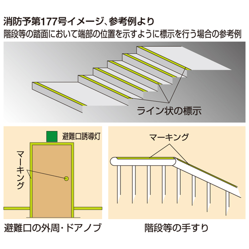 ・平成22年4月9日消防予第177号が発出され高輝度蓄光テープ等が「光を発する帯状の標示」という法令用語として定義され、照度不足の箇所において高輝度蓄光式誘導標識を設置する際のサポート用品として認められました。・避難誘導標識のサポートや、SWGSの誘導ラインとして幅広くお使いいただけます。 ・6時間発光も可能です。200lxで20分間照射した際の20分後の輝度が140mcd/平方メートルあります。(照度環境により異なります) [品番/呼称]FLAY-2510 [サイズ]25mm×10m×0.4mm [重量]192g [材質]PET・カッティングシート貼(矢印部) 購入に関する注意事項