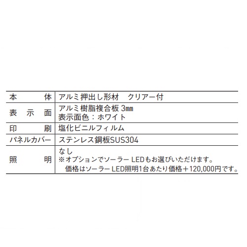 標準ピクト仕様 [支柱色] ダークブロンズ [サイズ]W1020mm×H1800mm [表示有効寸法]W900mm×H886mm [重量]20kg [照明]なし ※ オプションでソーラー LED(外付タイプ)もお選びいただけます。価格はソーラー LED照明1台あたり価格+120,000円です。 購入に関する注意事項 ・表示のピクトは画4枚目の標準ピクト11種よりお選びください。(標準ピクト仕様) ・納期:お問い合わせください。 ・画像は代表画像になります。