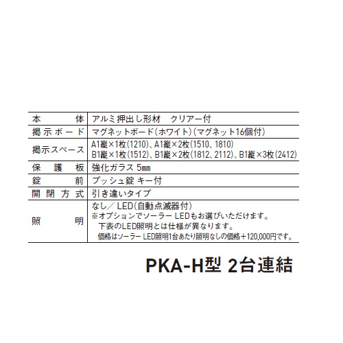 [外寸法]W3038mm×H1262.5mm[提示有効寸法]W1:1396mm×H1:1093mm [重量]91kg [本体]アルミ押出し形材 クリアー付 購入に関する注意事項 ・電気工事が必要な場合、必ず電気工事店へ依頼してください。 ・納期:お問い合わせください。 ・オプション(有料)でソーラー LED(外付タイプ)もお選びいただけます。 特長 シンプルな引き違いタイプで、スペースに合わせ各サイズの壁付連結が可能です
